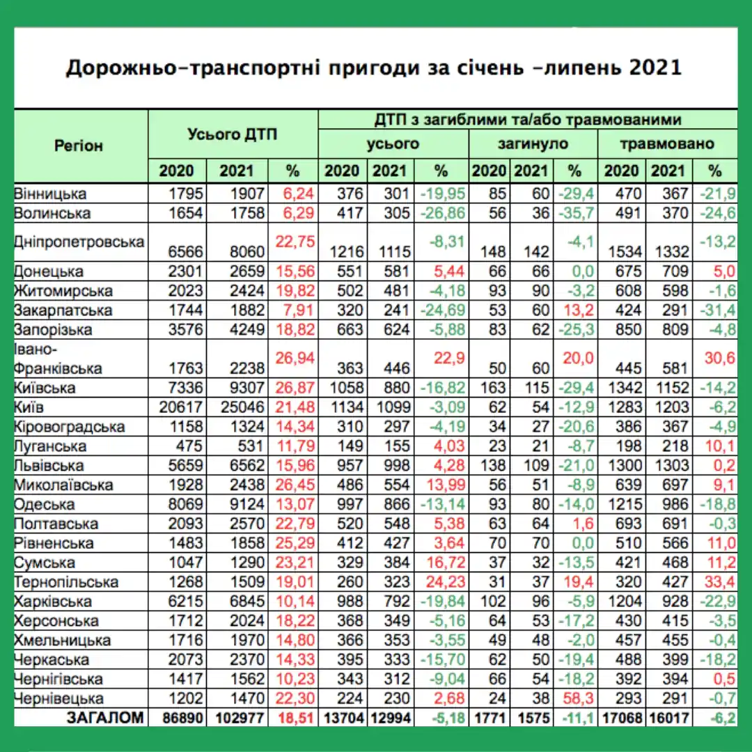 Незважаючи на збільшення аварійності, травматизм і смертність у ДТП знизилися. Так, із початку року в аваріях постраждали 16 017 осіб, а загинуло – 1575 осіб. Порівняно з показниками 2020-го результати цього року покращилися на 6,2 і 11,1% відповідно. Статистика по областях: Закарпатська — 291 особа (-31,4%), Волинська — 370 постраждалих (-24,6%) та Харківська — 928 осіб (-18,2%).