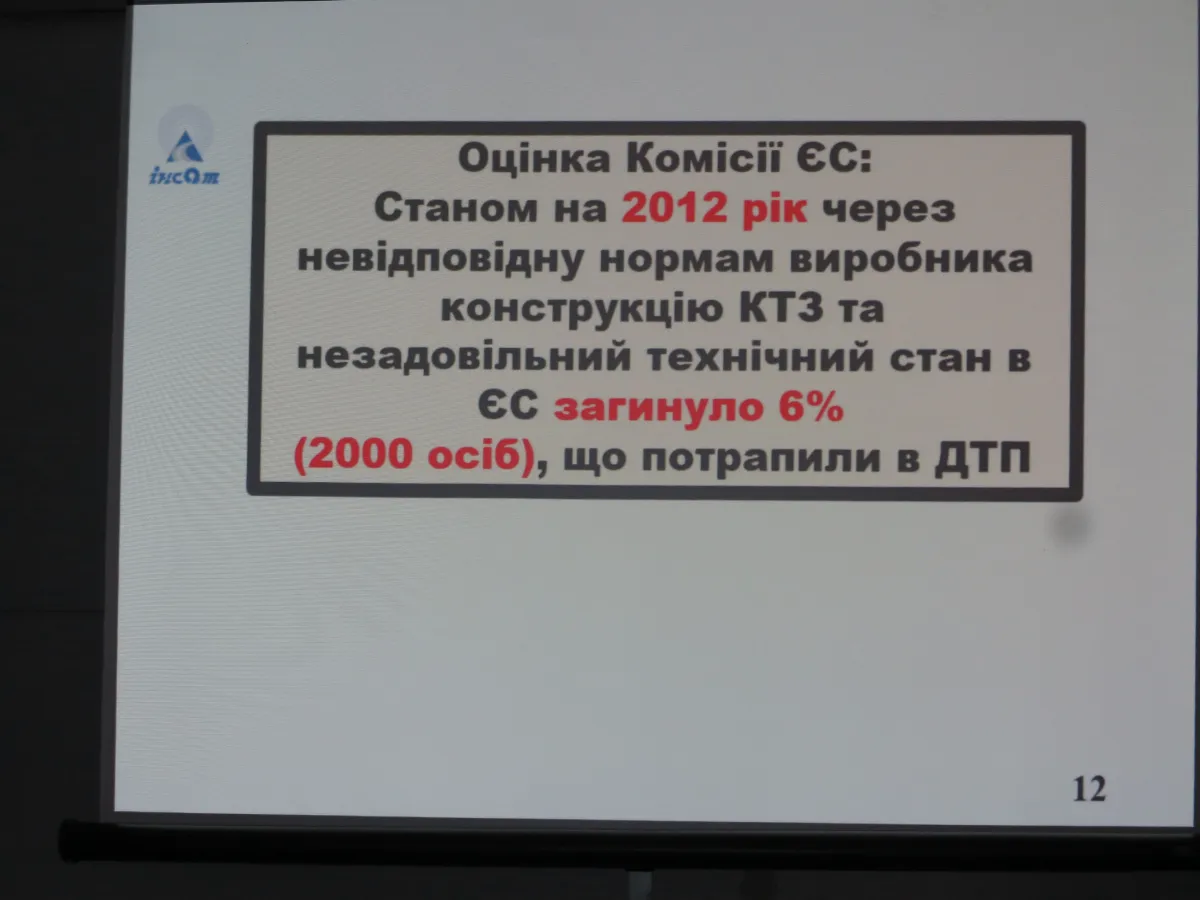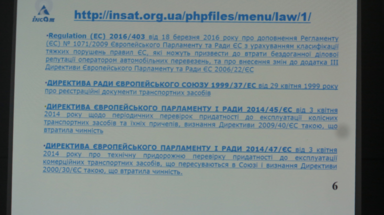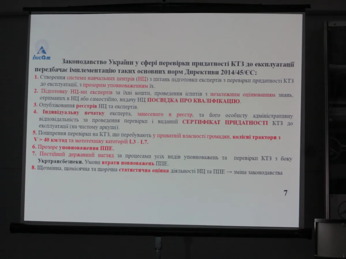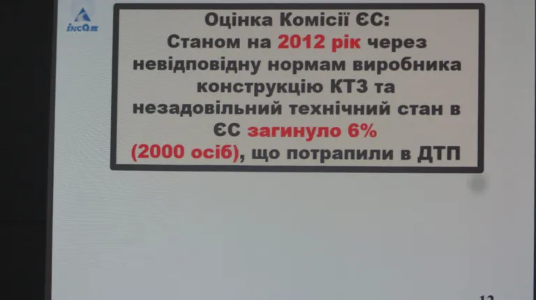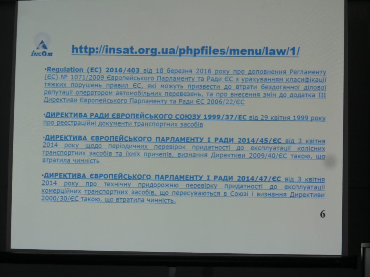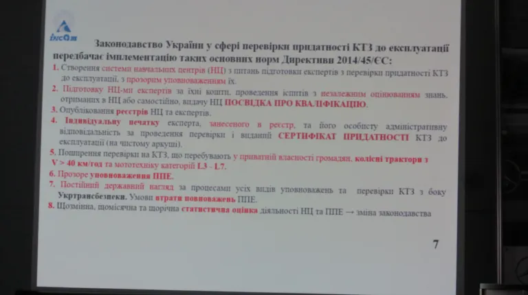 Необходима система учебных центров, которые бы готовили персонала для проведения техосмотра. В Украине, на мой взгляд, должно быть не менее 6 – 8 таких заведений. Такие учебные центры должны заноситься в реестр. Эксперт должен иметь собственную печать – и только он сможет выдавать сертификат на соответствие ТС. Предусмотрен переходной период – 3 года. Еще одна новация Директивы: обязательный техосмотр будет распространяться и на колесные тракторы, движущиеся со скоростью свыше 40 км/ч. А также на мотоциклы категорий L3 – L7, то есть с двигателями рабочим объемом от 125 см куб.