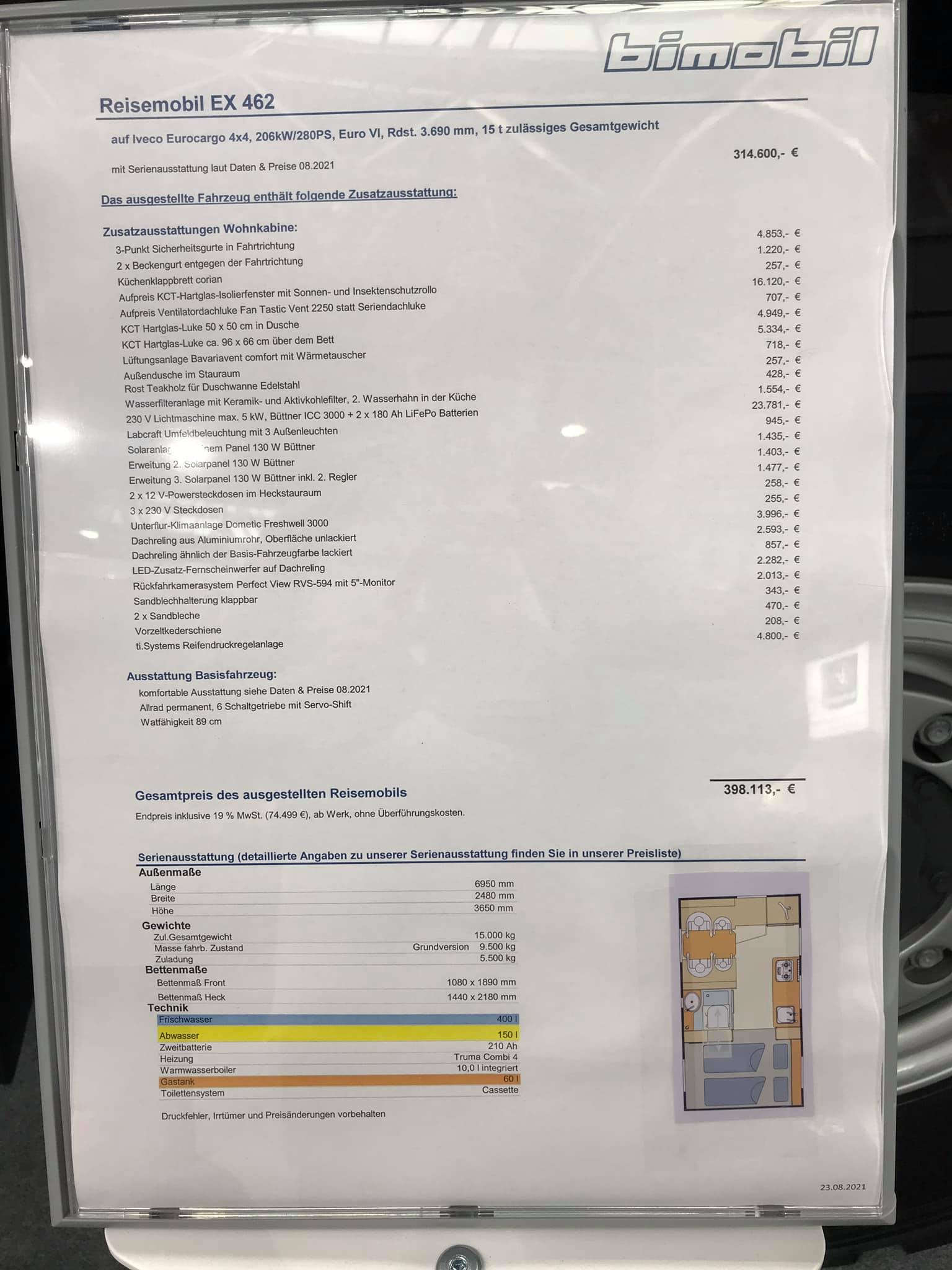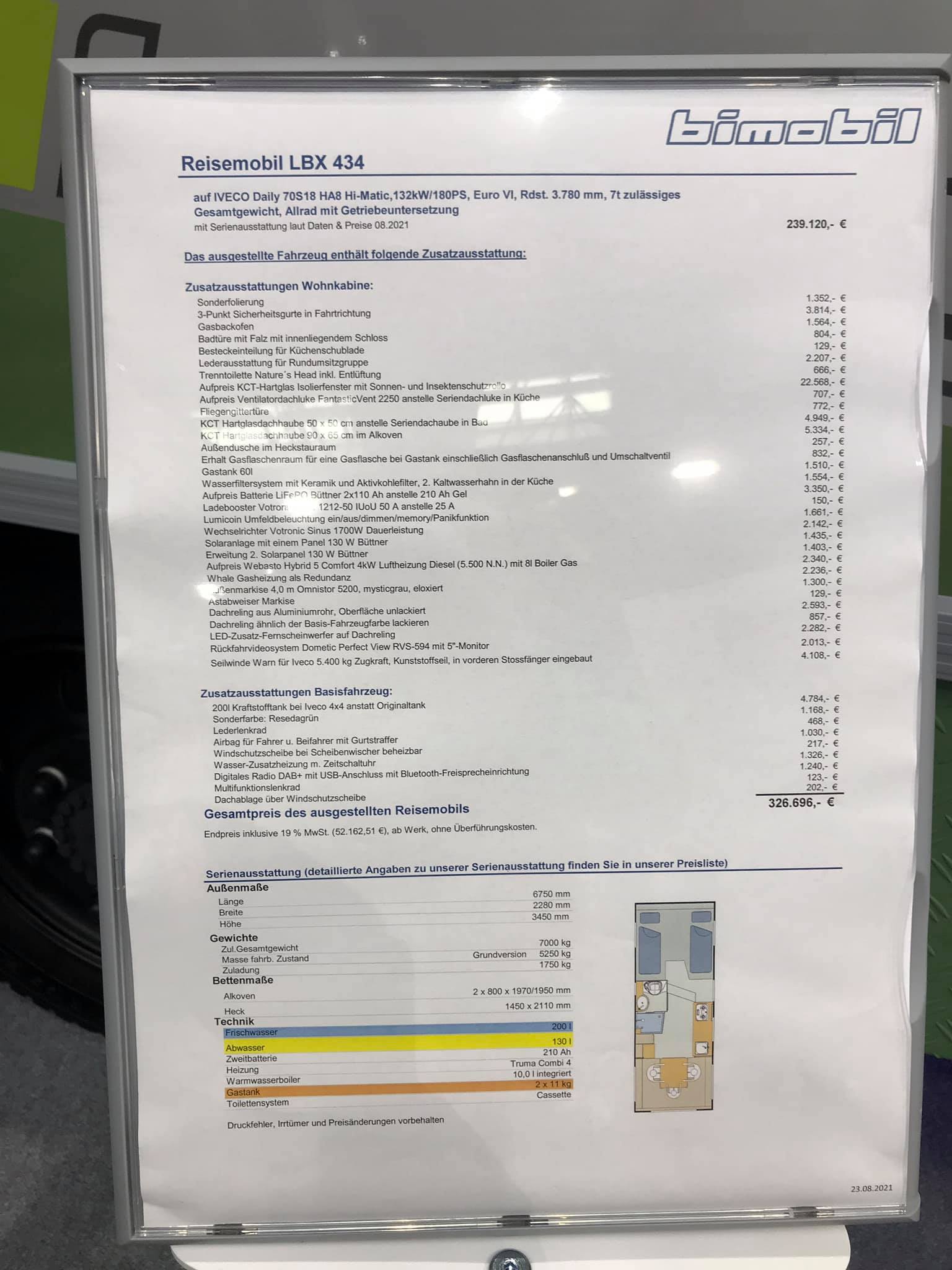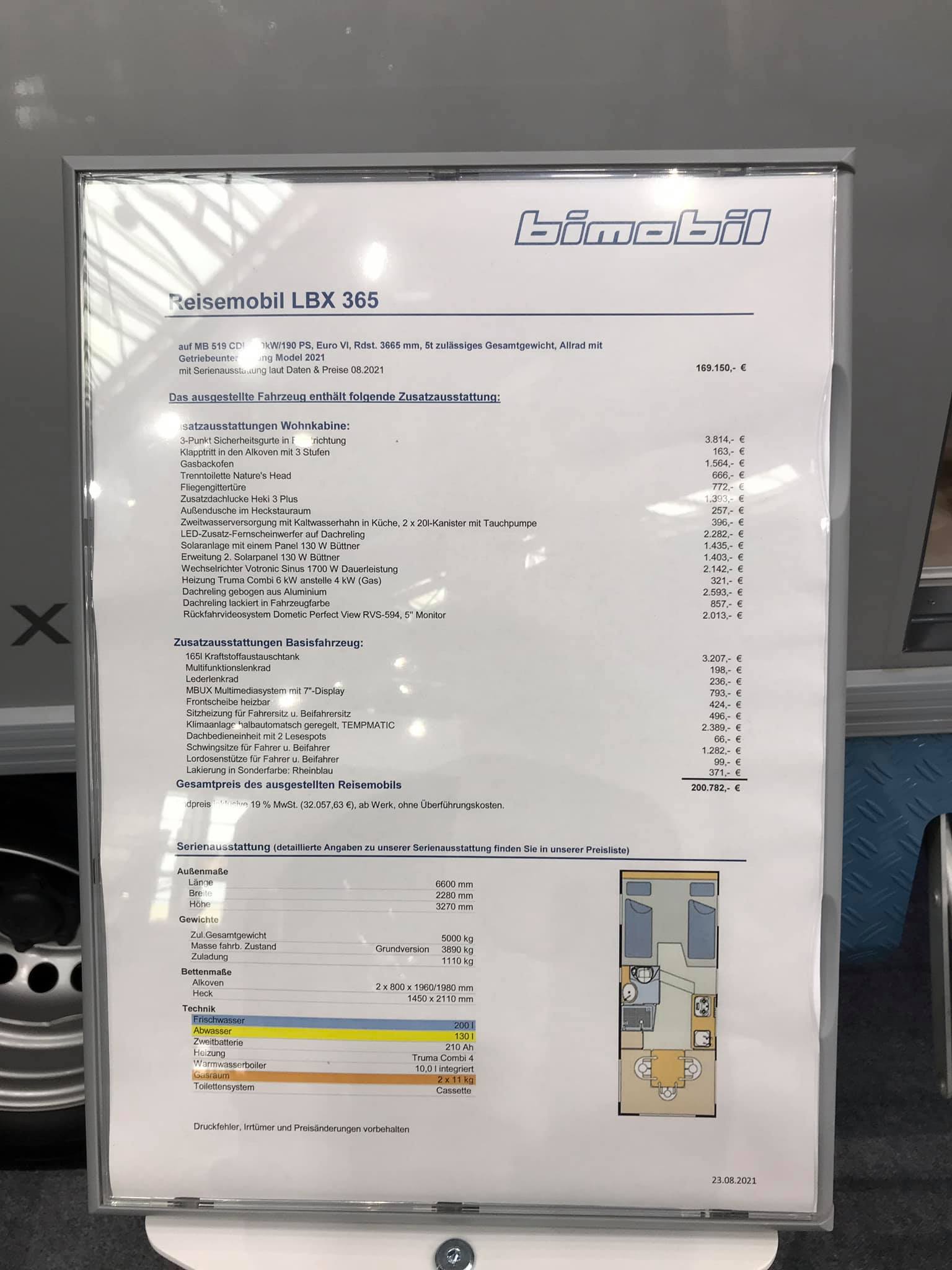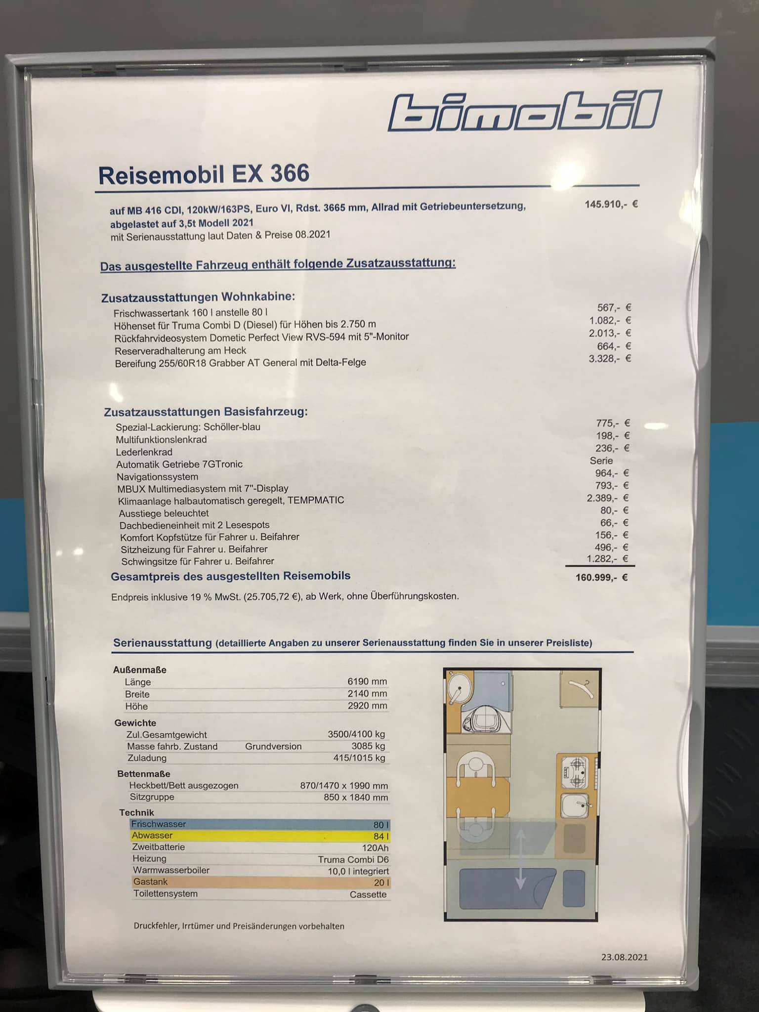 Если говорить о кемперах Bimobil, то на Сaravan Salon можно было увидеть самые различные модели на любой вкус и кошелек. Например, это EX 366 на полноприводном шасси Mercedes-Benz Sprinter 416 CDI – с базовой ценой 145 910 евро, а включая данную машину с рядом опций – 160 999 евро.
