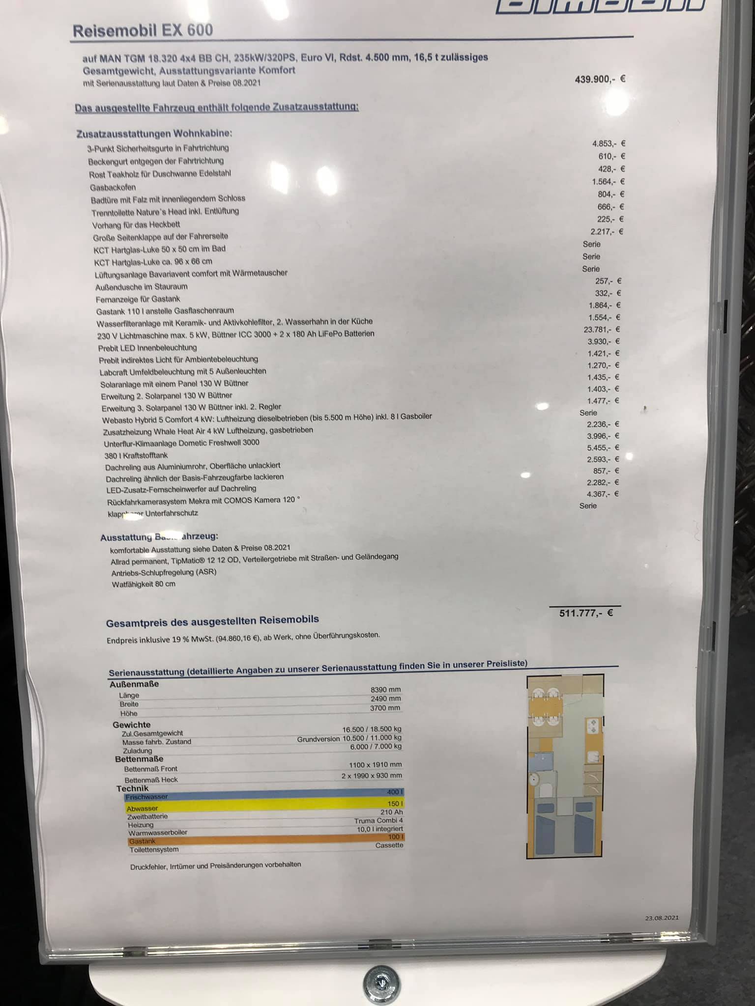 Ну а для действительно состоятельных караванеров в экспозиции был приготовлен уникальный аппарат – модель EX 600 на внедорожном шасси MAN TGM 18.320 – полной массой 16,5 т и двигателем в 320 л. с. Такой «домик» продается от 439 900 евро, а с учетом многочисленных опций, как вариант на выставке – за 511 777 евро.