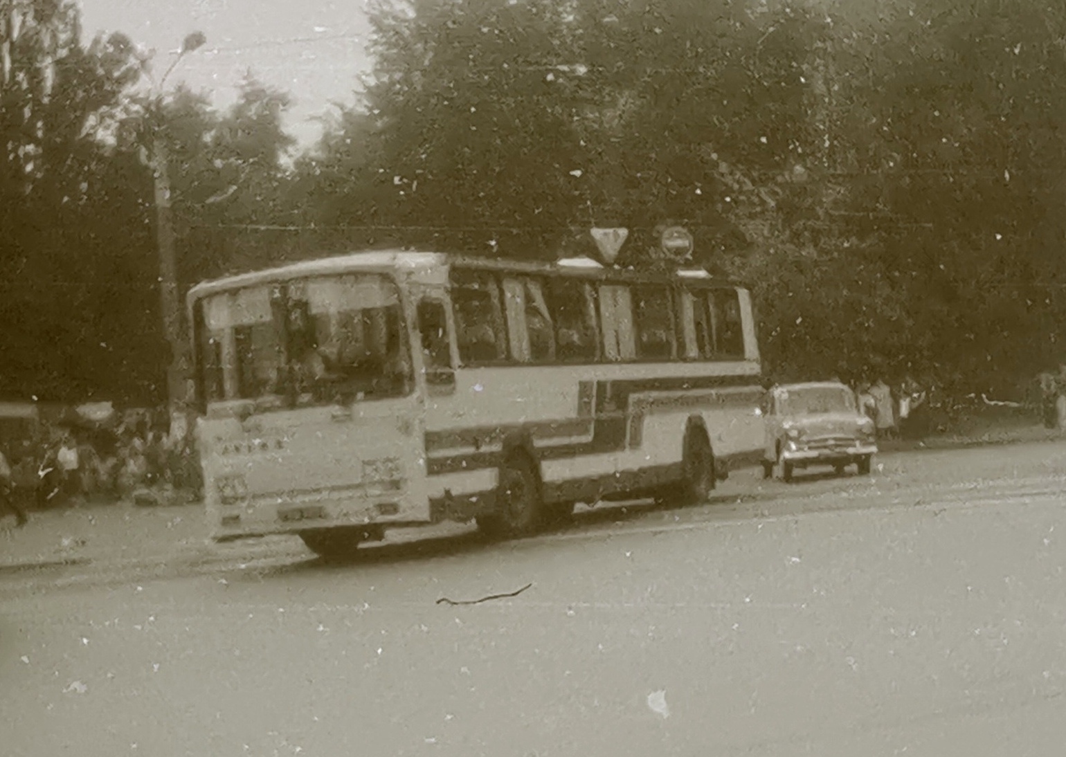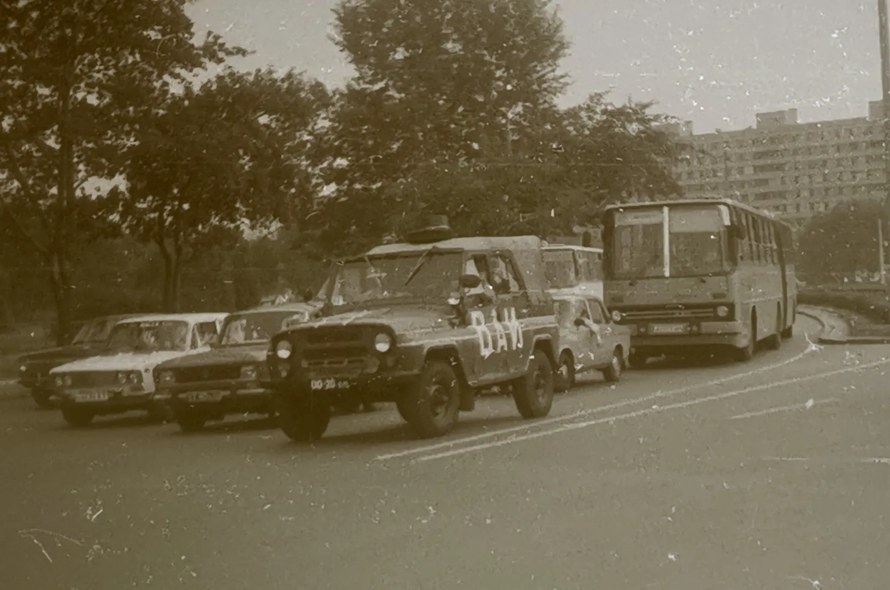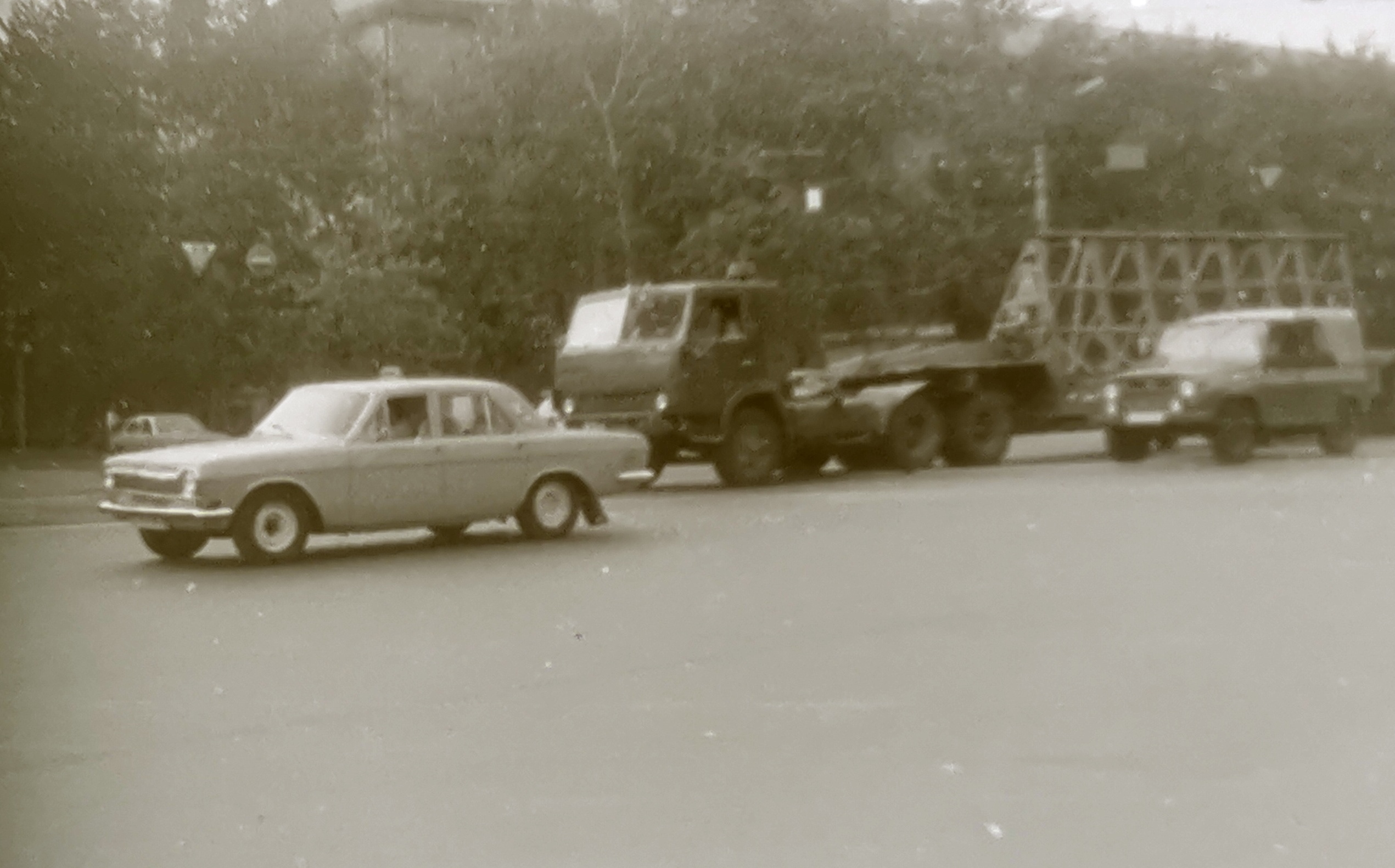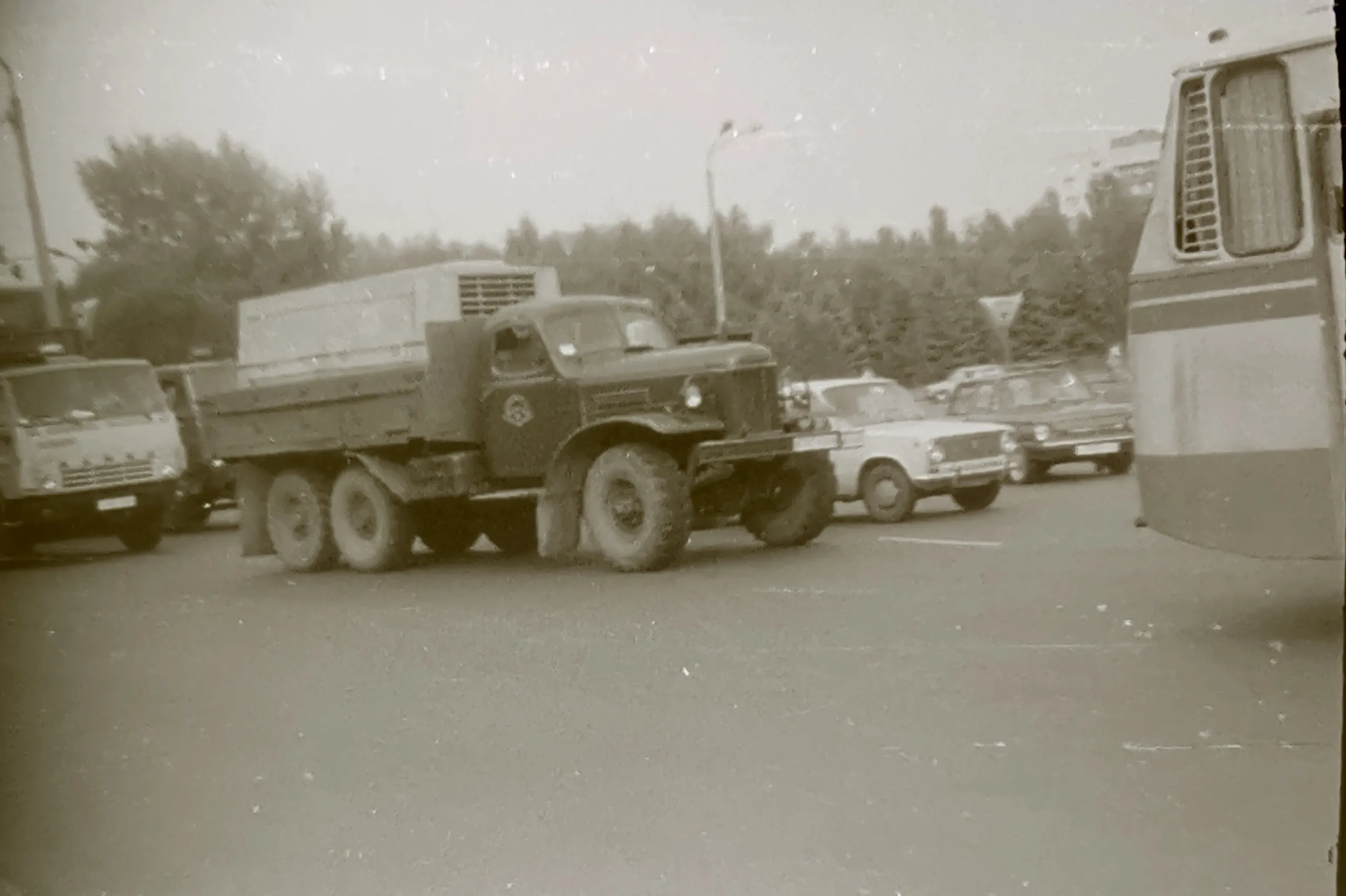 Заслуговує увагу й туристичний автобус югославської марки TAM. Наприкінці 80-х ці біло-блакитні автобуси з написом Intourist на борту були свіжим віянням, порівняно з уже звичними «Ікарусами». З боків від нього можна побачити відразу два РАФ-2203 – автомобіль швидкої допомоги та мікроавтобус.