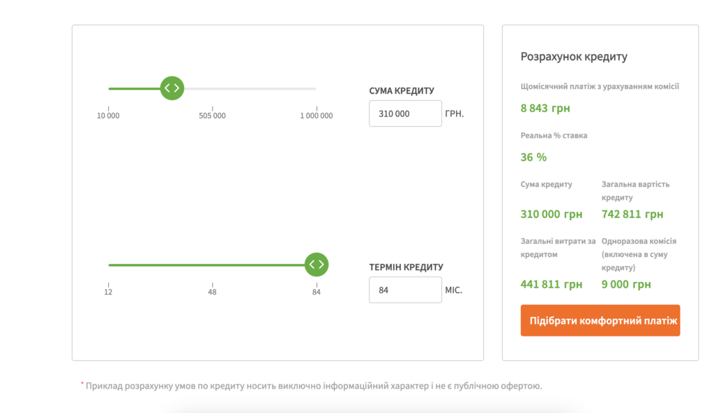 Фактичні умови кредитування, включно з розміром щомісячного платежу, залежать від оцінки кредитоспроможності клієнта та визначаються в індивідуальному графіку платежів, що є невід’ємною частиною кредитного договору.