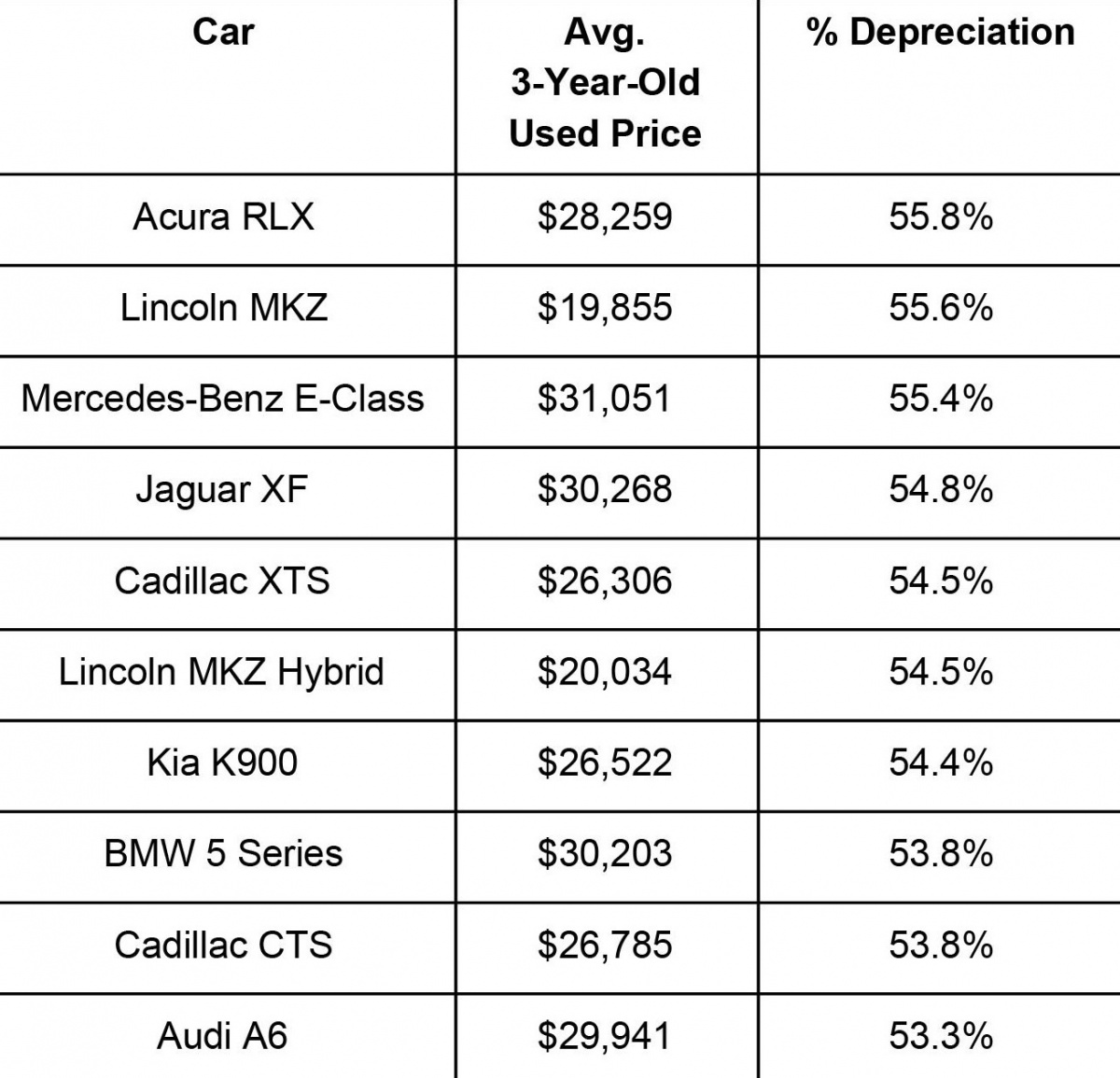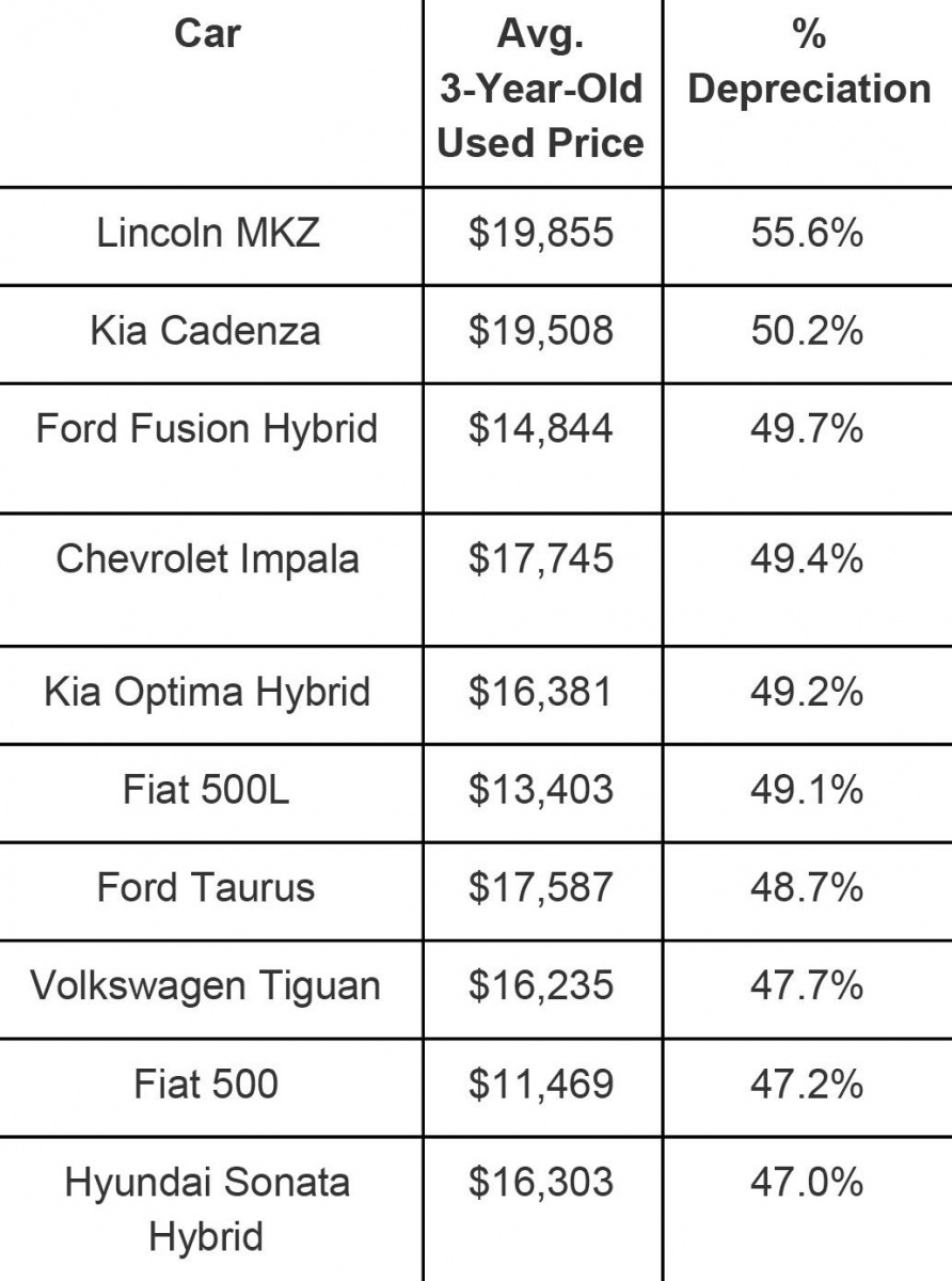 Як видно, всі автомобілі в першій десятці – це машини представницького сегмента, і через три роки вони втрачають більше половини початкової ціни. Отож, найспокусливішою пропозицією на ринку уживаних авто виявиться Lincoln MKZ, за який в трирічному віці попросять близько 20 тис. дол.