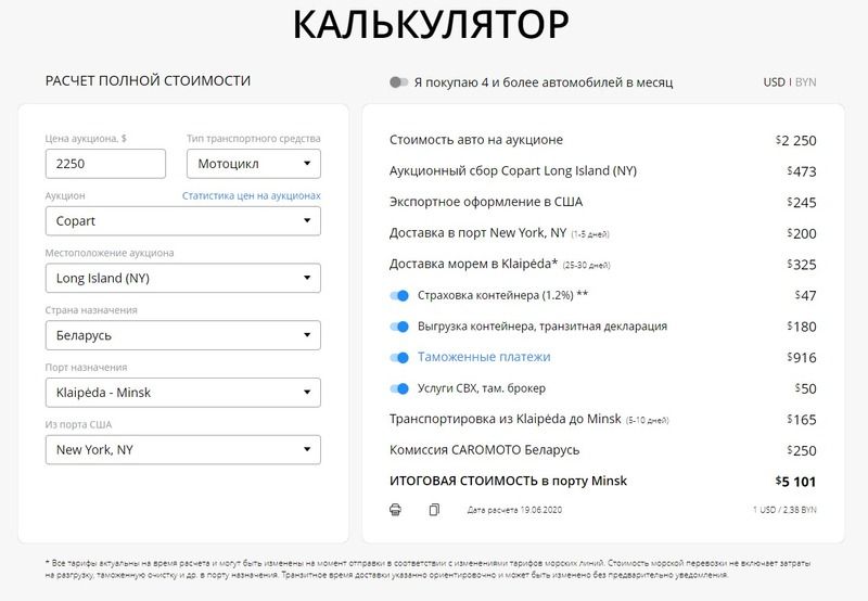 Также, бесплатно гость сайта может воспользоваться точным калькулятором (с главной страницы, с карточки лота), показывающим полный перечень платежей, который предстоит оплатить покупателю: прописан каждый пункт с реальными и неизменными значениями. Мы не говорим: «Ориентировочная цена с учетом доставки составит примерно..», мы говорим: «Стоимость выбранного автомобиля со всеми платежами составит ровно столько-то..».
