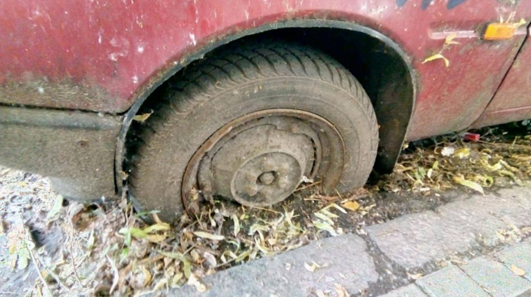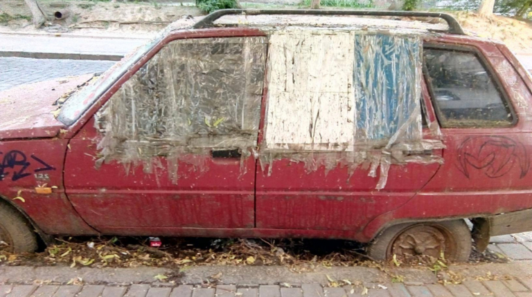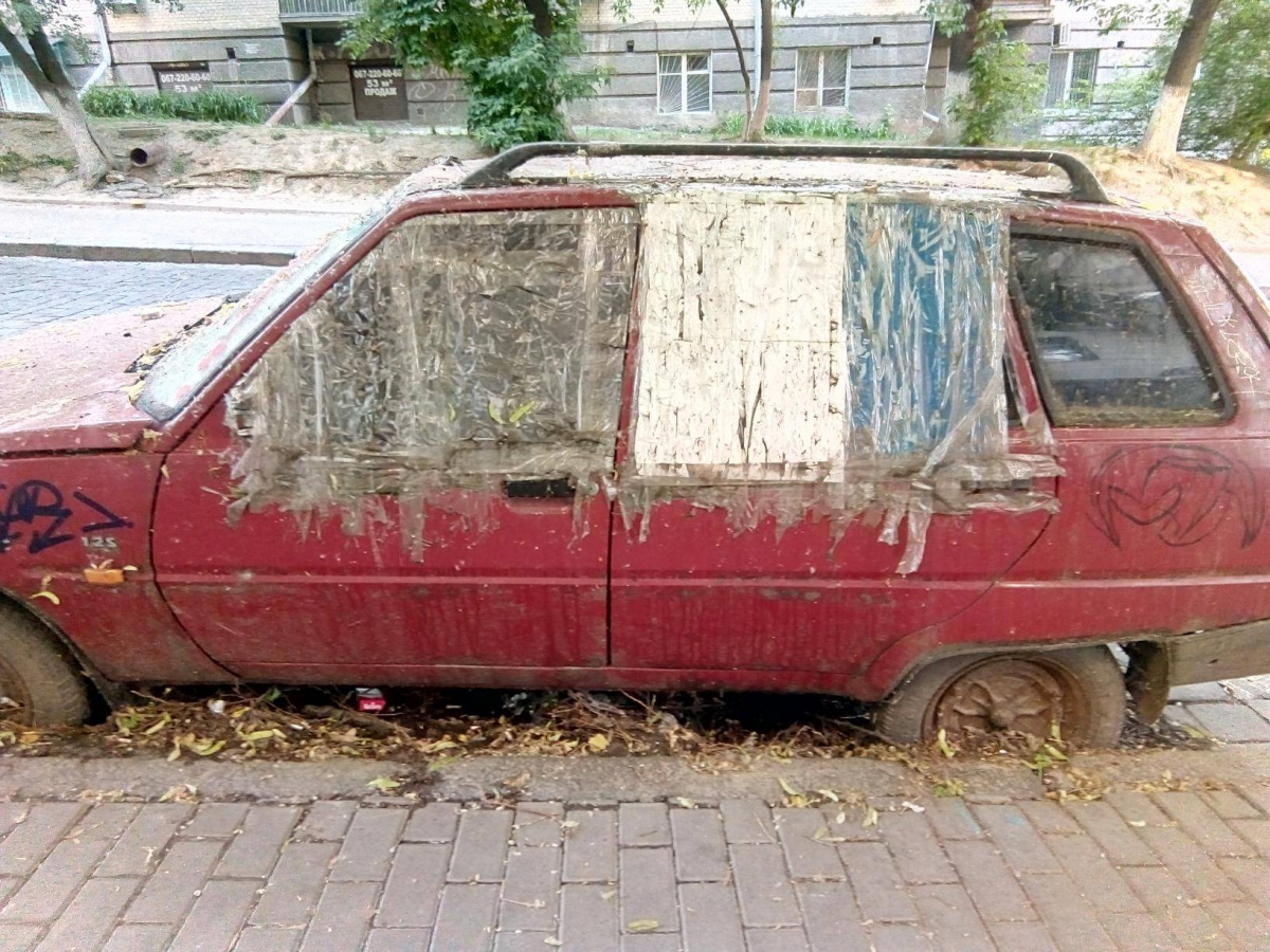 Хоча цю машину радше можна назвати кинутою. Тільки подивіться на її стан! Бічного скла немає (замість нього — брезент і скотч), колеса спущені і, здається, почали вростати в бруківку, а кузов… Загалом навіть якісно помити її буде недостатньою мірою.