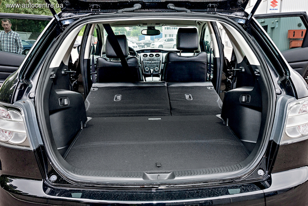 Оформление салона подчеркивает горячий темперамент CX-7: трехспицевый руль, высокий центральный тоннель, круглые колодцы щитка приборов и висящие вертикально вниз, как у спорткаров, стрелки указателей. Покритиковать можно плоские передние кресла и ограничивающие обзор передние стойки.