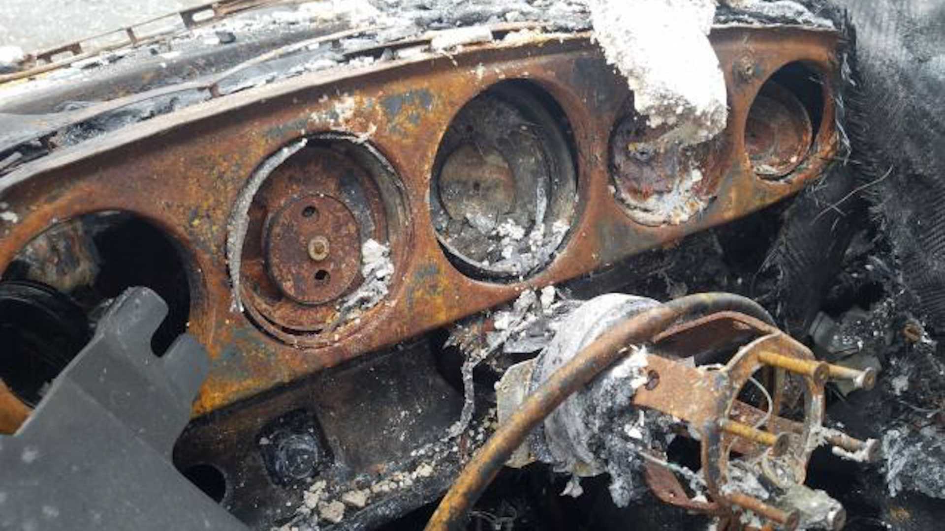 Залишки фарби дають змогу мати уявлення про колір кузова спорткара. Ззаду видніється двигун. У салоні майже нічого не лишилося: оббивка згоріла, а передні сидіння забиті сміттям. Рульове колесо і прилади відсутні зовсім.