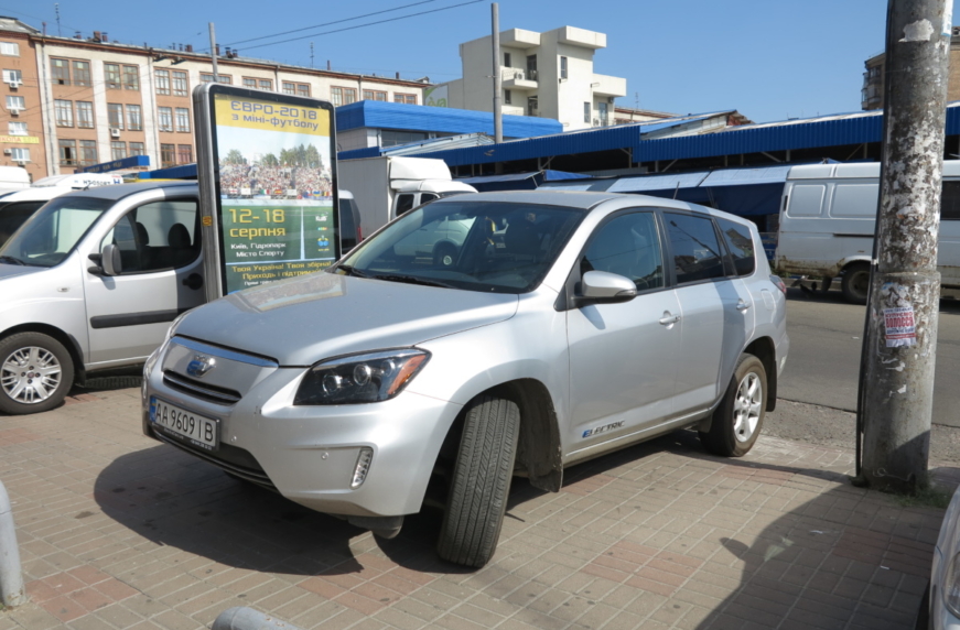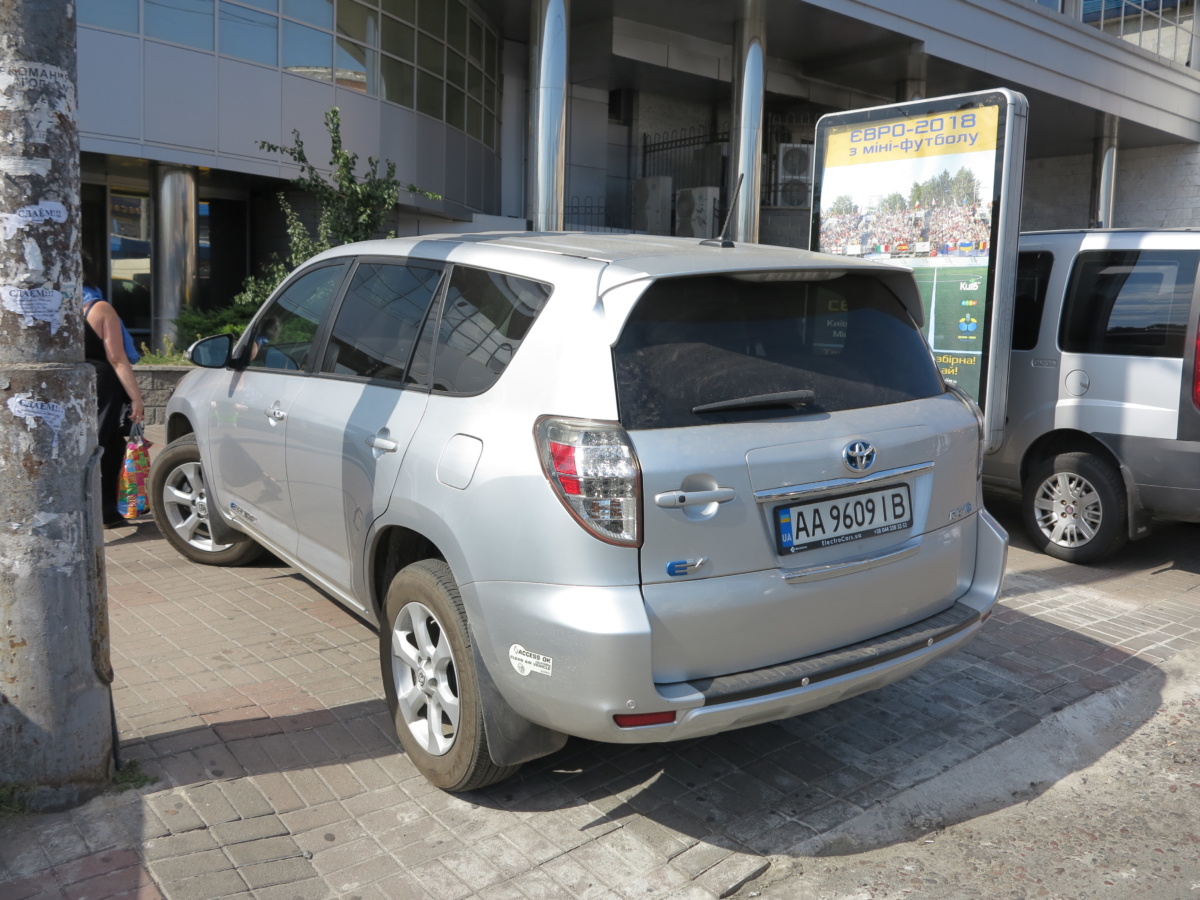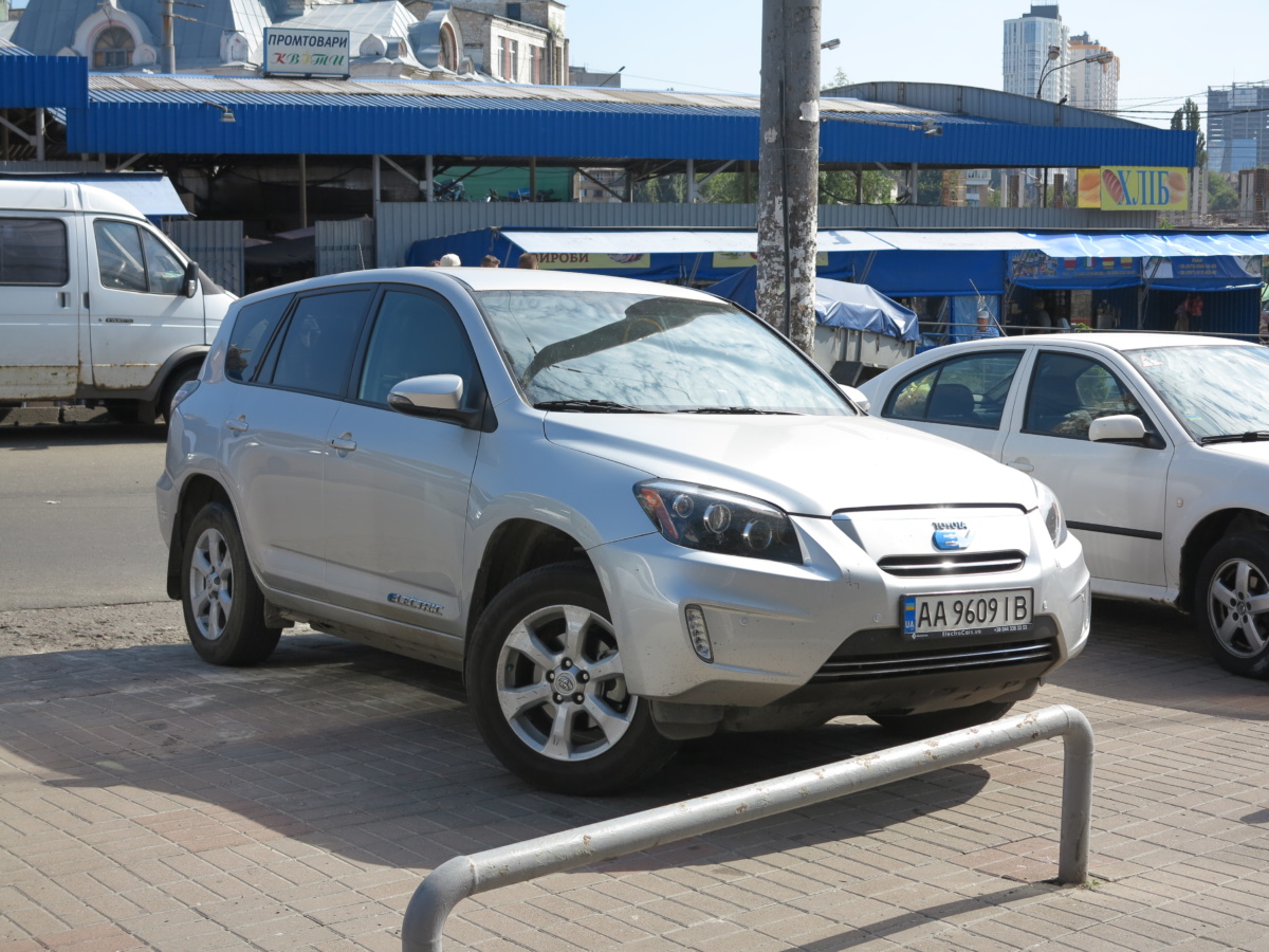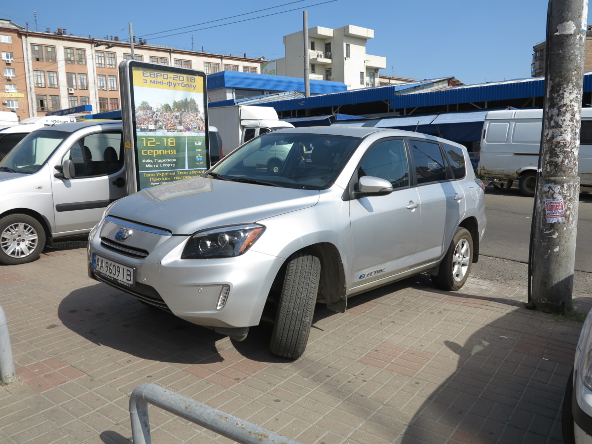 Электрический кроссовер Toyota RAV 4 EV выпускался всего три года – с 2012 по 2014-й. За все время было изготовлено только 2500 машин, которые, главным образом, предназначались для штата Калифорния, в котором самые строгие экологические нормы. (Кстати, на заднем бампере снятой в Киеве машине есть наклейка с указанием того, что автомобиль соответствует экологическим стандартам Калифорнии).