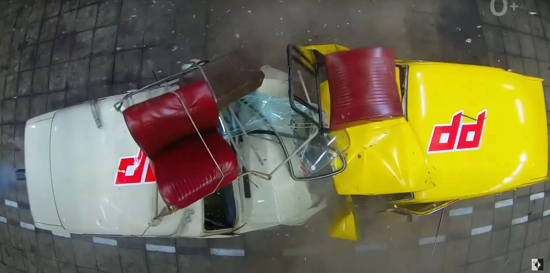 Під час експерименту автомобілі розвели у різні боки гаража і приступили до найцікавішого. Зіткнення було видовищним, а результат того, що сталося, насправді було складно передбачити. Як виявилося, обидва автомобілі показали себе не найкращим чином. Але якщо у водія і пасажирів ВАЗ-2106 ще був би шанс вижити, то у тих, хто сидів би в Москвичі, – ні.